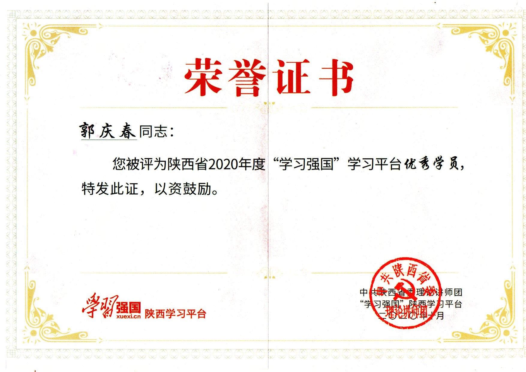 郭慶春同志榮獲“學(xué)習(xí)強(qiáng)國(guó)”省級(jí)優(yōu)秀學(xué)員稱號(hào)