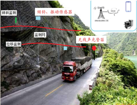 解決方案:在崩塌體上加裝監(jiān)視網(wǎng),通過對檢測網(wǎng)多個部位作位移、傾斜、震動等高精度實時監(jiān)測,達(dá)到對整個崩塌體實時監(jiān)測預(yù)警的目的,在崩塌體下方公路上設(shè)置無線報警終端設(shè)備(包括無線信號接收器、聲光警笛、LED警示屏、太陽能供電系統(tǒng)),當(dāng)智能檢測終端檢測到變形超過設(shè)定預(yù)警閾值時即時啟動報警程序,以避免人員傷亡和減小財產(chǎn)損失。