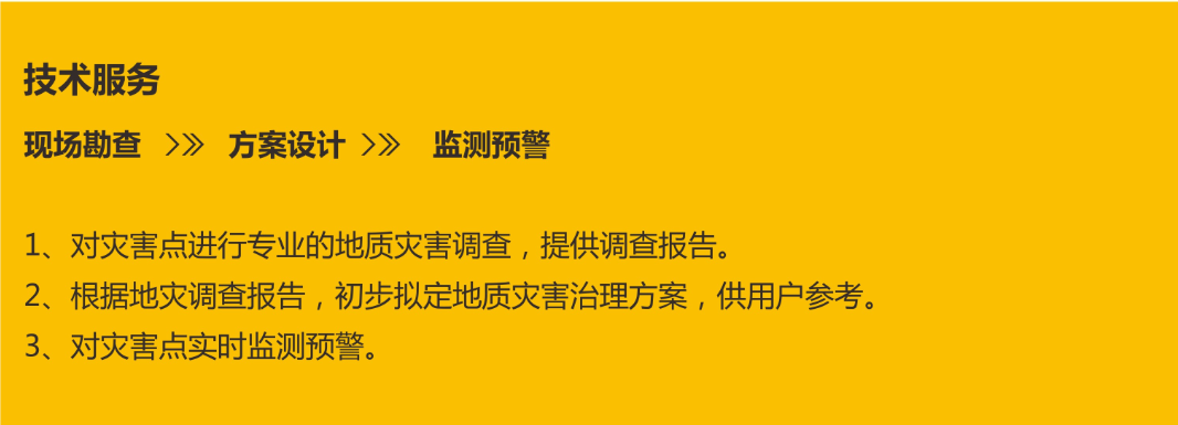 地災(zāi)服務(wù)中心既有專利的支撐,又有技術(shù)和科研能力,根據(jù)用戶需求,對災(zāi)害點進(jìn)行專業(yè)的地質(zhì)災(zāi)害調(diào)查,根據(jù)調(diào)查報告,初步擬定地質(zhì)災(zāi)害治理方案,結(jié)合方案安裝設(shè)備,進(jìn)行實時監(jiān)測預(yù)警。同時對用戶提供現(xiàn)場培訓(xùn),及電話指導(dǎo)故障維修或者現(xiàn)場排除故障等一體化服務(wù)。
