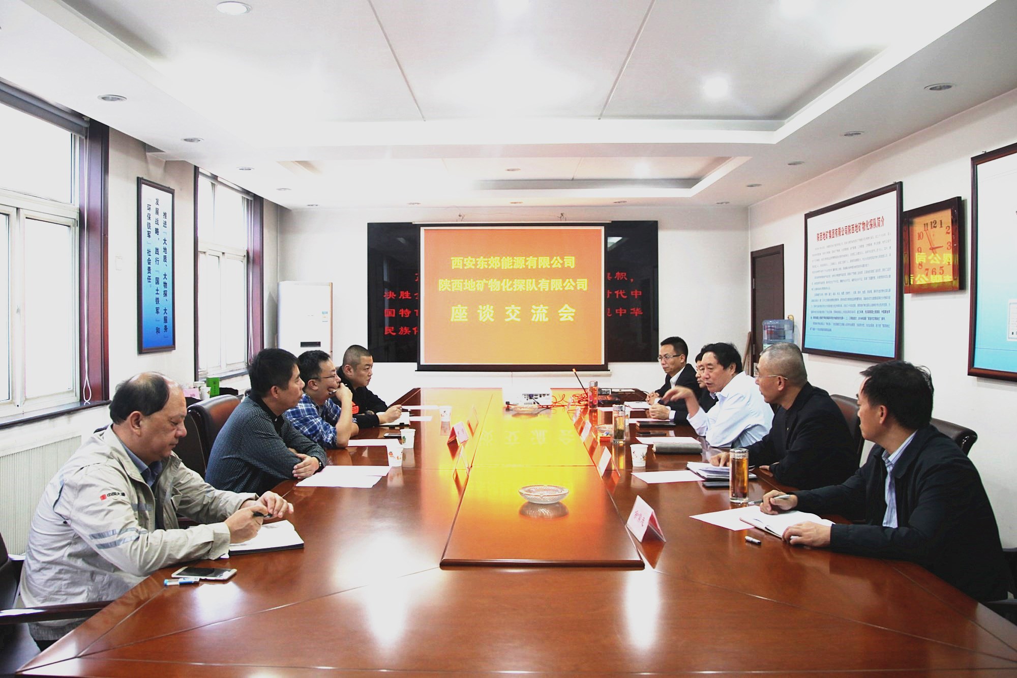 ? ? 西安東新新能源熱力有限公司總經理萬象、副總經理楊凱,物化探隊有限公司黨委副書記、工會主席、紀委書記趙養科,副總經理李新勝、余常忠參加了交流座談。